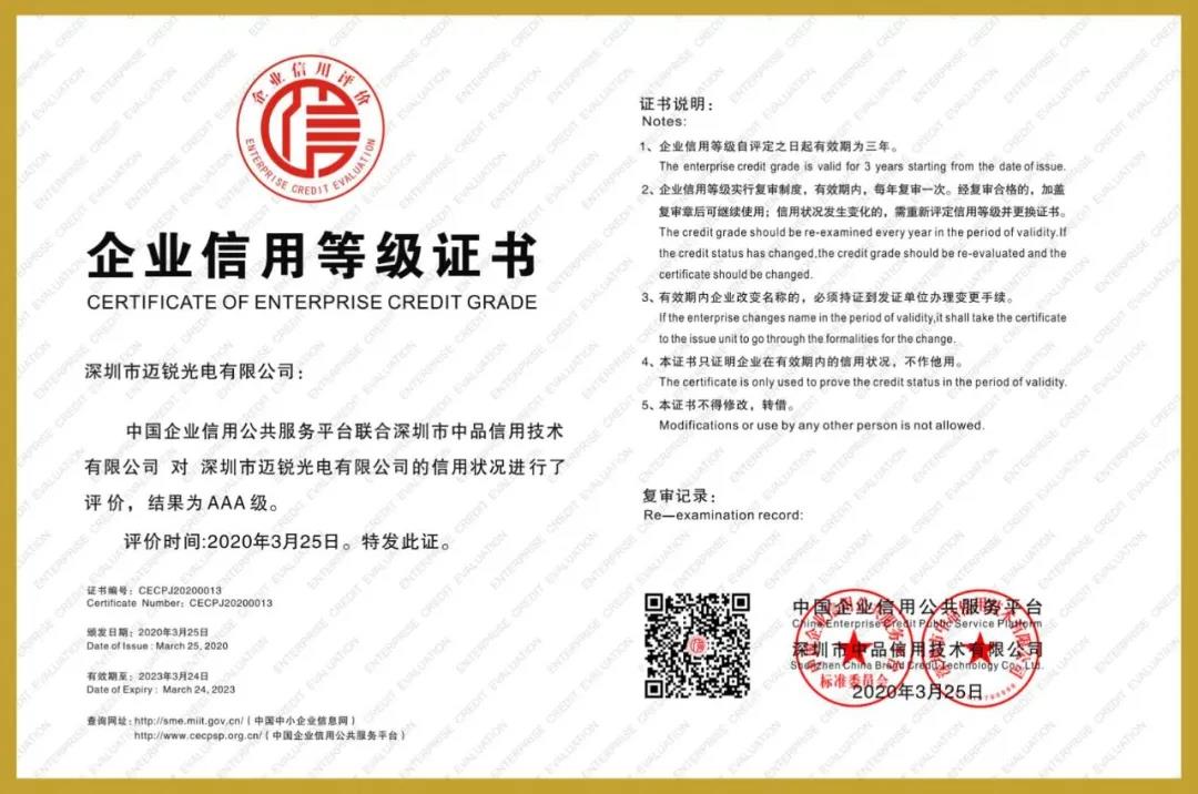 近日,通过中国企业信用公共服务平台和深圳市中品信用技术有限公司的评估,星空电竞光电二次获得AAA级信用企业证书-信用程度高,合同履约能力强,具有优秀的信用纪录,经营状况佳,盈利能力强,发展前景广阔。